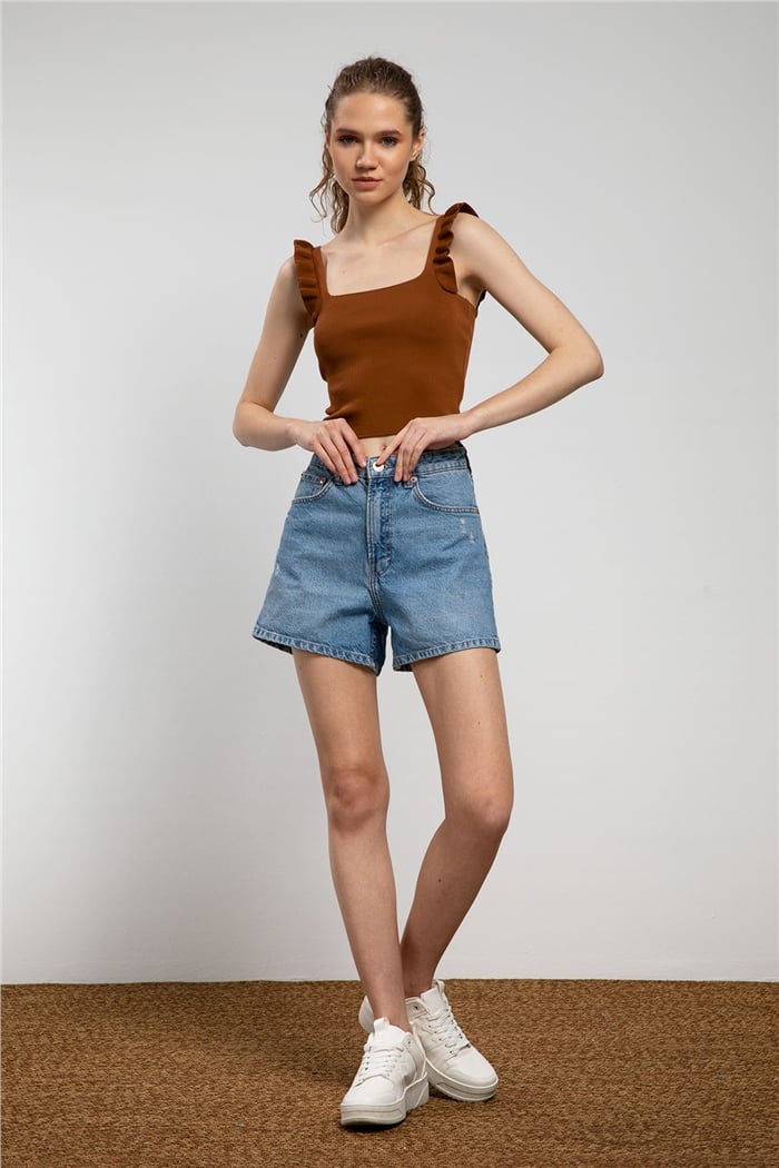 Avrile Kadın Askıları Fırfırlı Kare Yaka Triko Bluz TABA A91090-S (A91090-S)