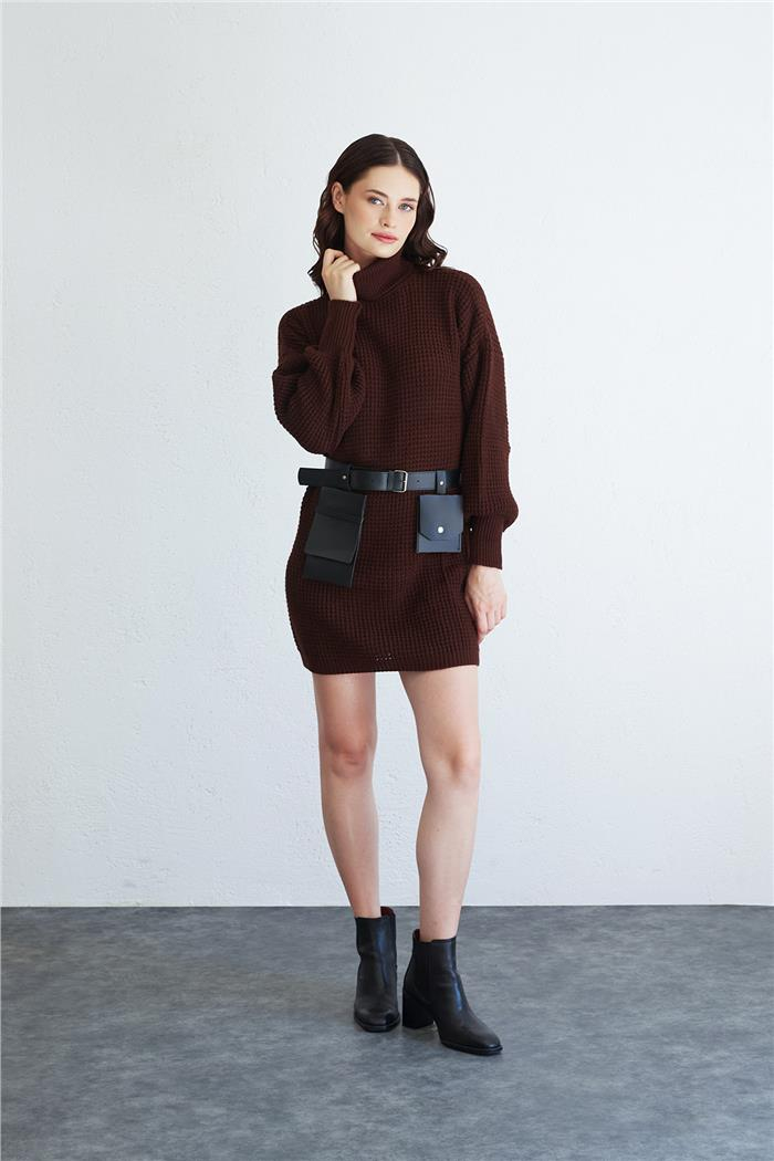 Avrile Kadın Balıkçı Yaka Deri Kemerli Triko Elbise KAHVE A91449-S (A91449-S)