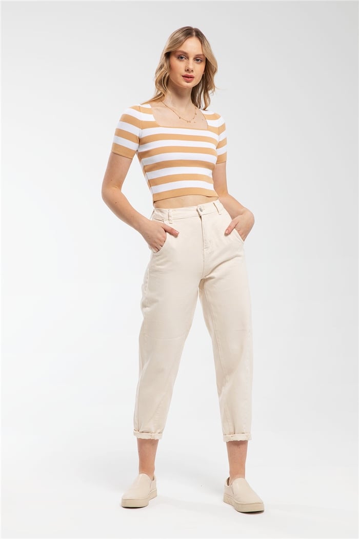 Avrile Kadın Çizgili Kare Yaka Triko Kazak CAMEL A91802-S (A91802-S)