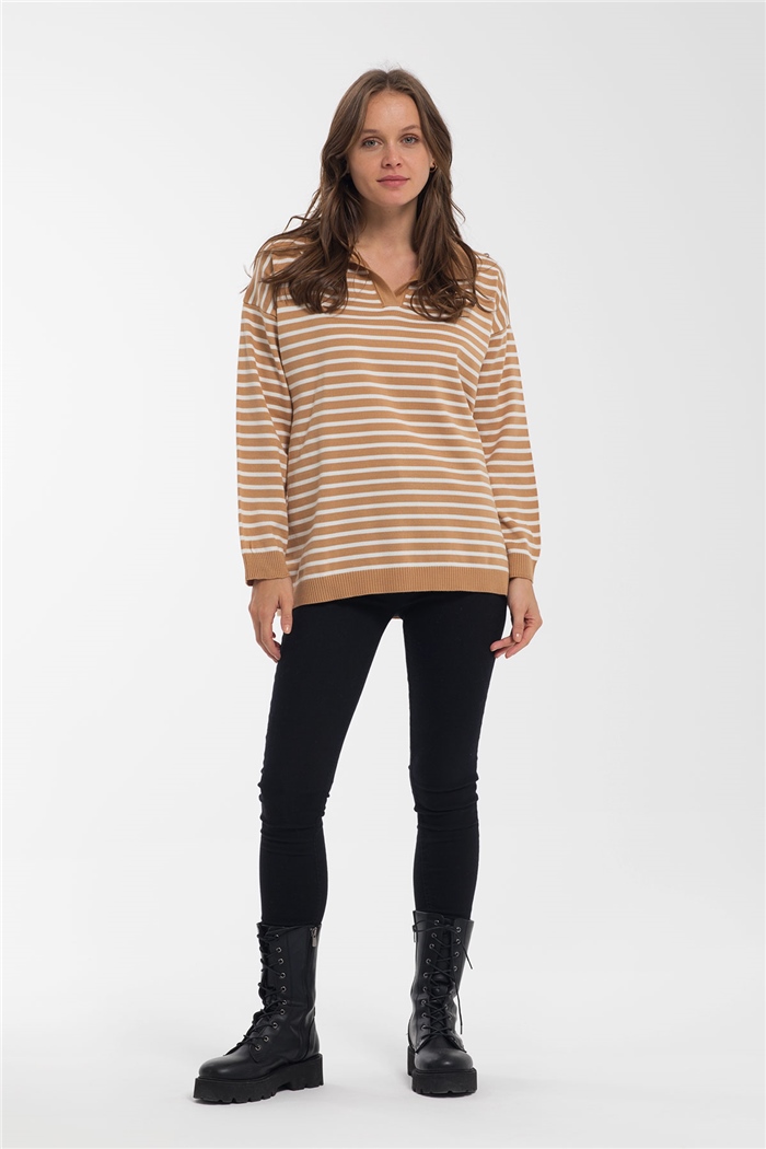 Avrile Çizgili Polo Yaka Salaş Triko Kazak  CAMEL-EKRU  A91899-S