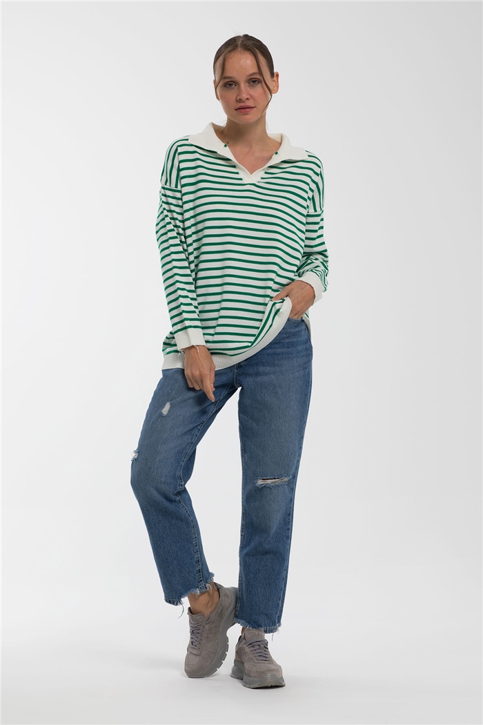 Çizgili Polo Yaka Salaş Triko Kazak A91899-S
