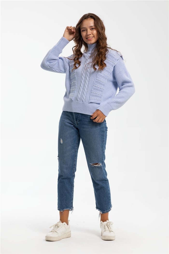 Avrile Kadın Dik Yaka İnci Frfırlı Triko Kazak MAVİ A91827-S (A91827-S)