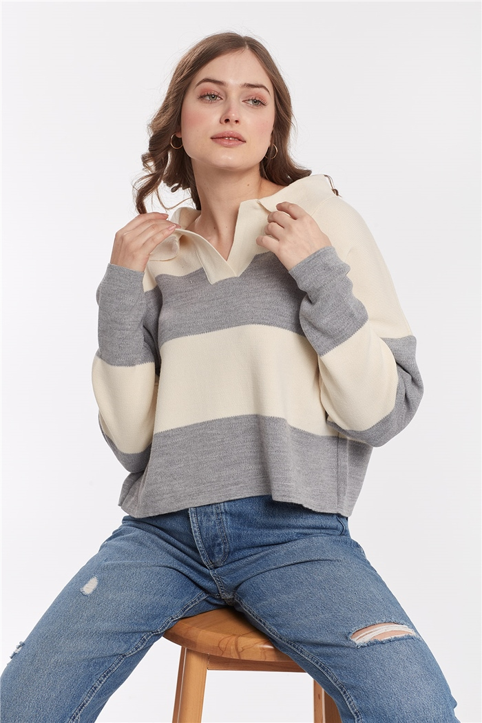 Avrile Gömlek Yaka Kalın Çizgili Triko Kazak  KREM-GRİ  A91941-S