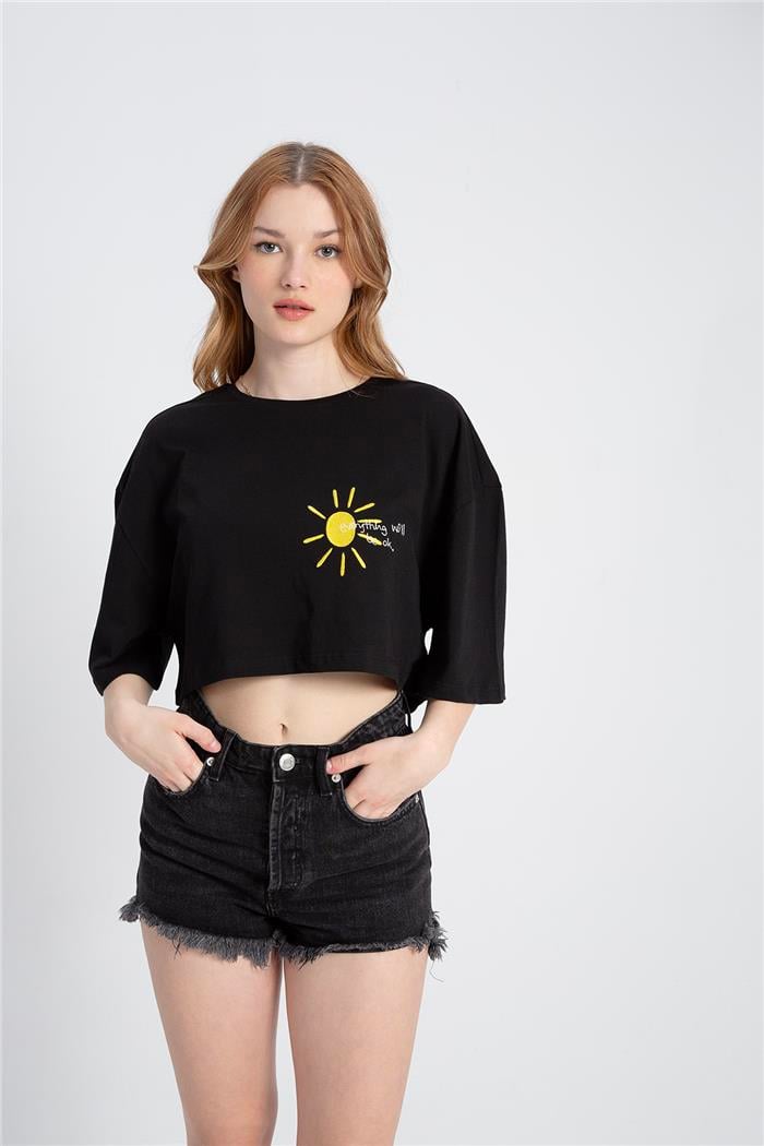 Avrile Kadın Baskılı Crop T-Shirt SİYAH A23-10103 (A23-10103)