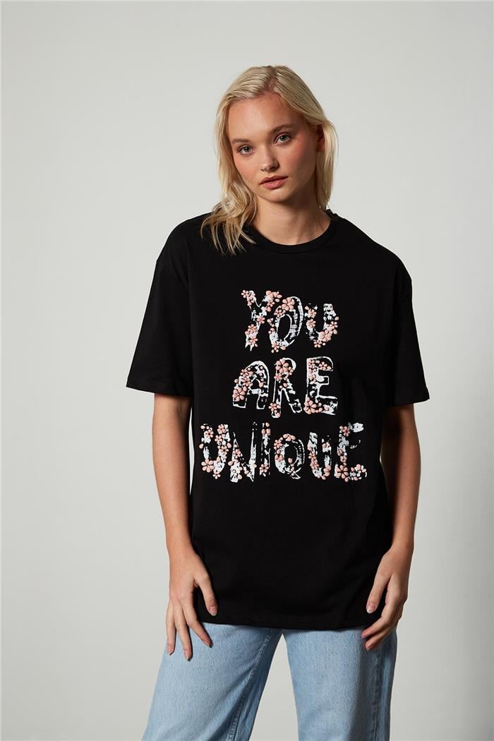 Avrile Kadın Çiçek Detaylı Baskılı Tişört SİYAH MA23-1006 (MA23-1006)