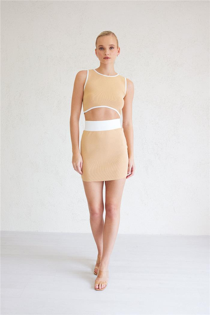 Avrile Kadın KONTRAST ÇİZGİ DETAYLI TRİKO TAKIM CAMEL-BEYAZ A92347-S