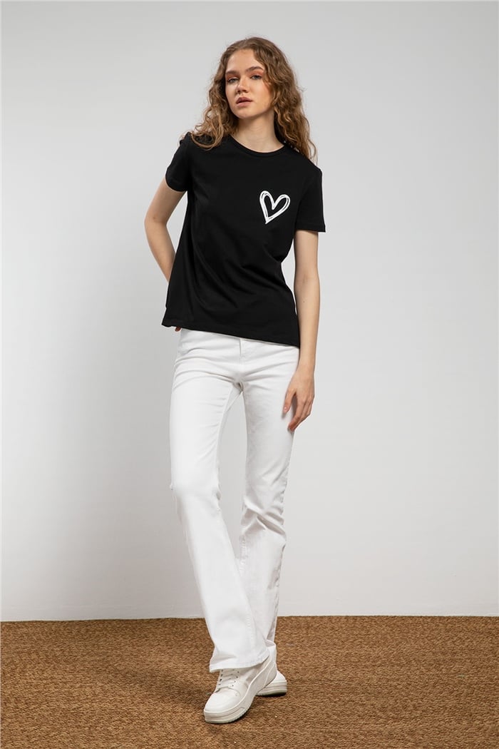 Avrile Kadın Kalp Baskılı T-Shirt SİYAH A21-10432 (A21-10432)