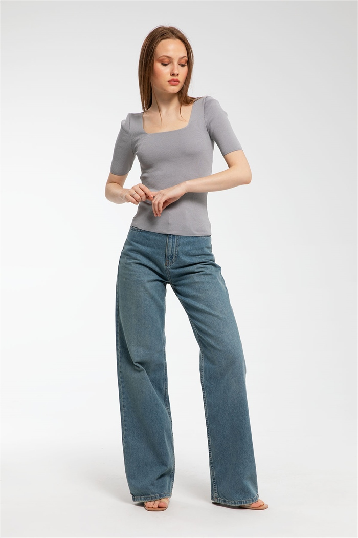 Avrile Kadın Kare Yaka Kısa Kollu Triko Kazak GRİ A91617-S (A91617-S)