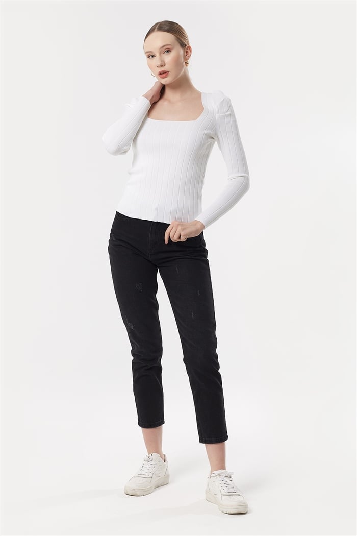 Avrile Kadın Kare Yaka Kolu Pileli Triko Kazak BEYAZ A91983-S (A91983-S)