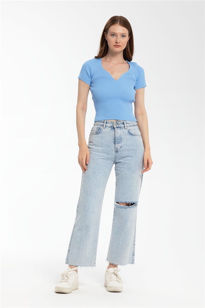Avrile Kadın Ön V Fitilli Kısa Kollu Triko Kazak BEBE MAVİ A91816-S (A91816-S)