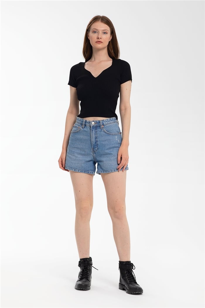 Avrile Kadın Ön V Fitilli Kısa Kollu Triko Kazak SİYAH A91816-S (A91816-S)