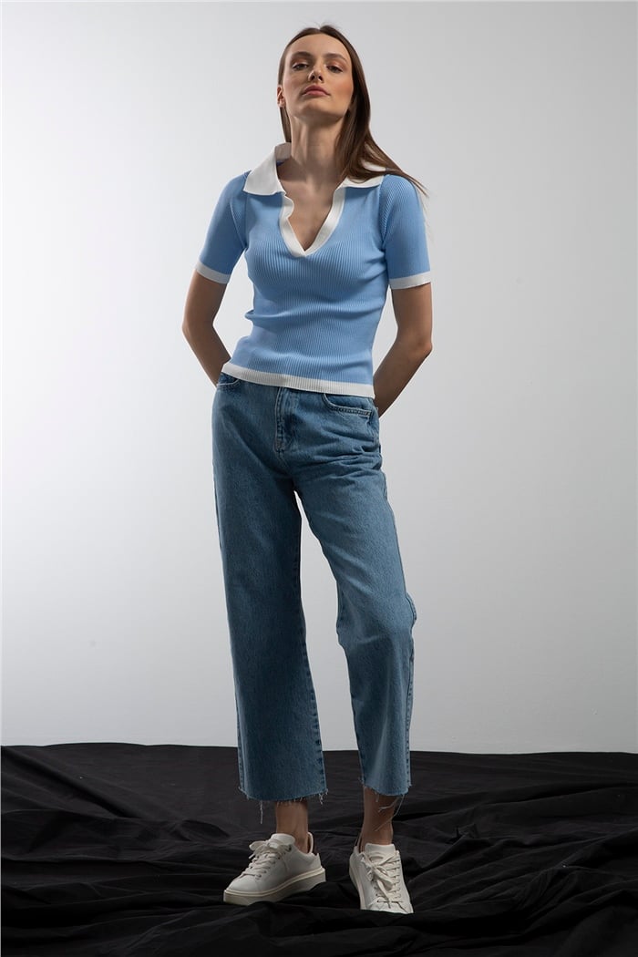 Avrile Polo Yaka Fitilli Triko Kazak  MAVİ  A91647-S