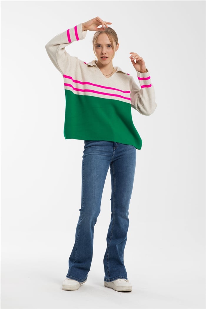 Avrile V Polo Yaka Çizgi Detaylı Triko Kazak  BENET-BEJ  A91901-S