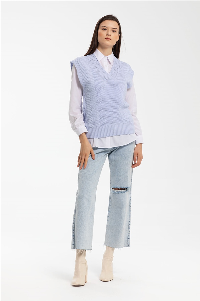 Avrile V Yaka Yırtmaçlı İçi Gömlekli Triko Süveter  MAVİ  A91320-S