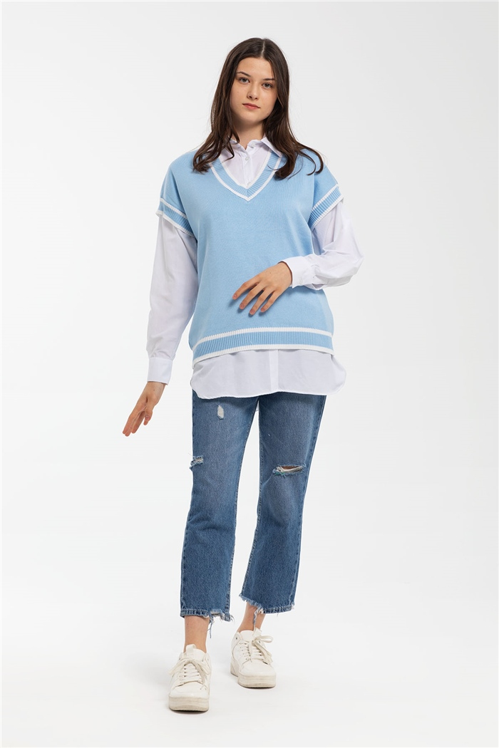 Avrile Kadın Yaka Ve Etek Ucu Çizgili Triko Süveter MAVİ A91692-S (A91692-S)