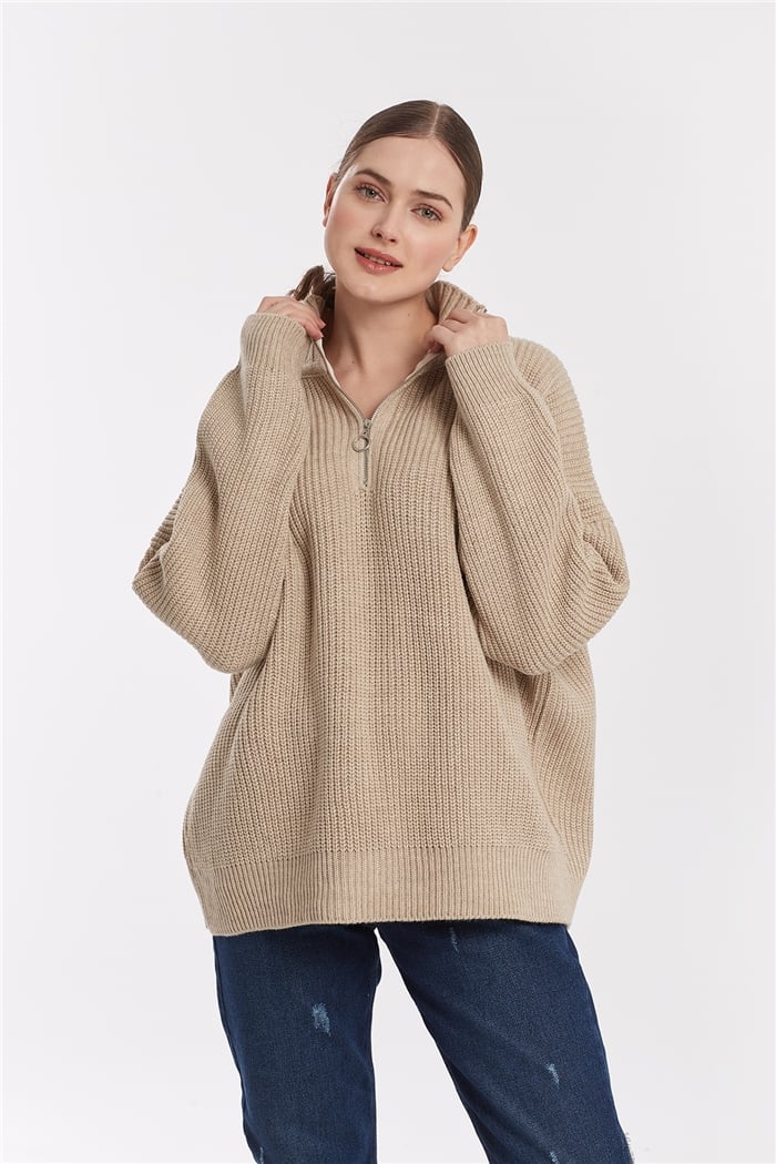 Avrile Yakası Fermuarlı Selanik Örgü Triko Kazak  BEJ  A91938-S