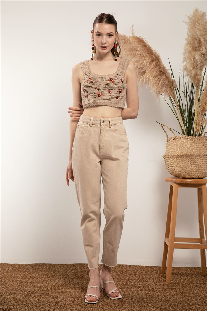Nisan Ajurlu Kare Yaka Nakışlı Triko Atlet  BEJ  TT3088-Z