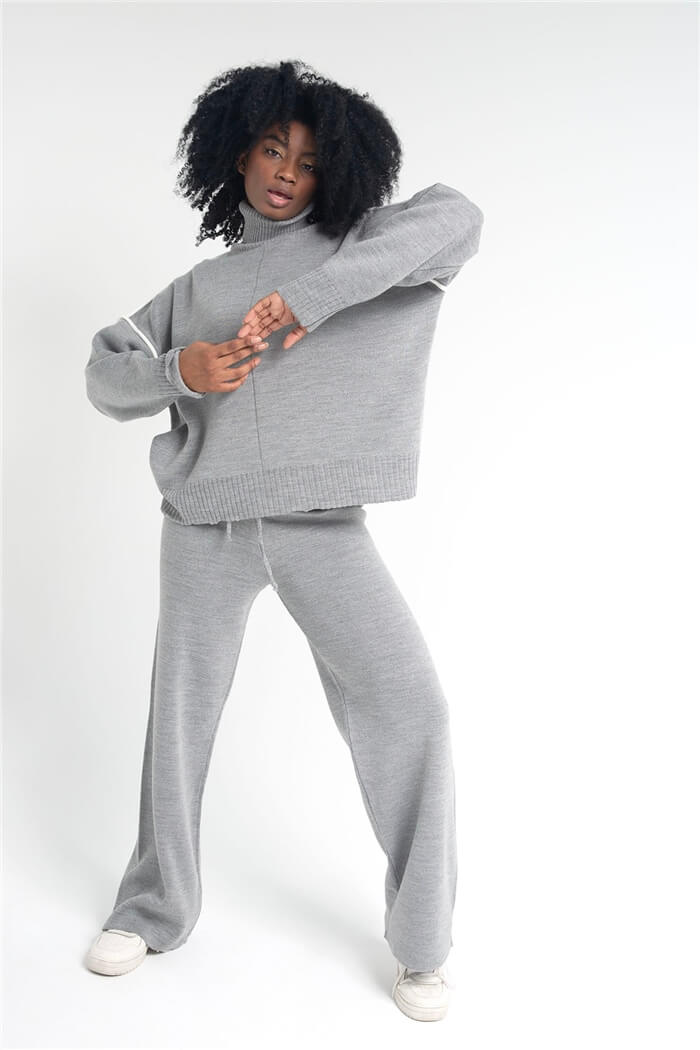 Nisan Kadın Çizgi Detaylı Triko Kazak ve Bol Paça Pantolon Takım GRİ-EKRU TT3797-Z