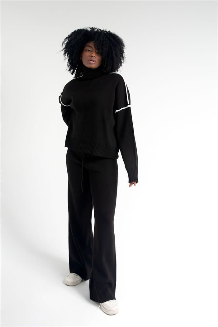 Nisan Kadın Çizgi Detaylı Triko Kazak ve Bol Paça Pantolon Takım SİYAH-EKRU TT3797-Z