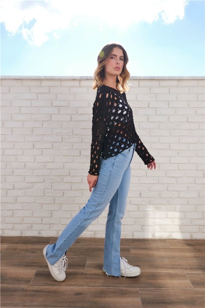 Kontrast yaratan renk geçişleri ile süslenen delikli triko kazaklar, zamansız şıklığı gözler önüne seriyor.