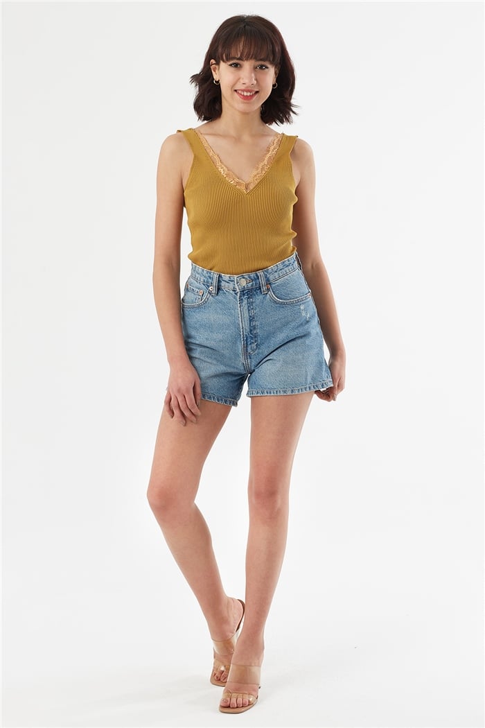 Nisan Kadın Fitilli V Yaka Dantelli Triko Atlet YAĞ YEŞİLİ TT1737 (TT1737)
