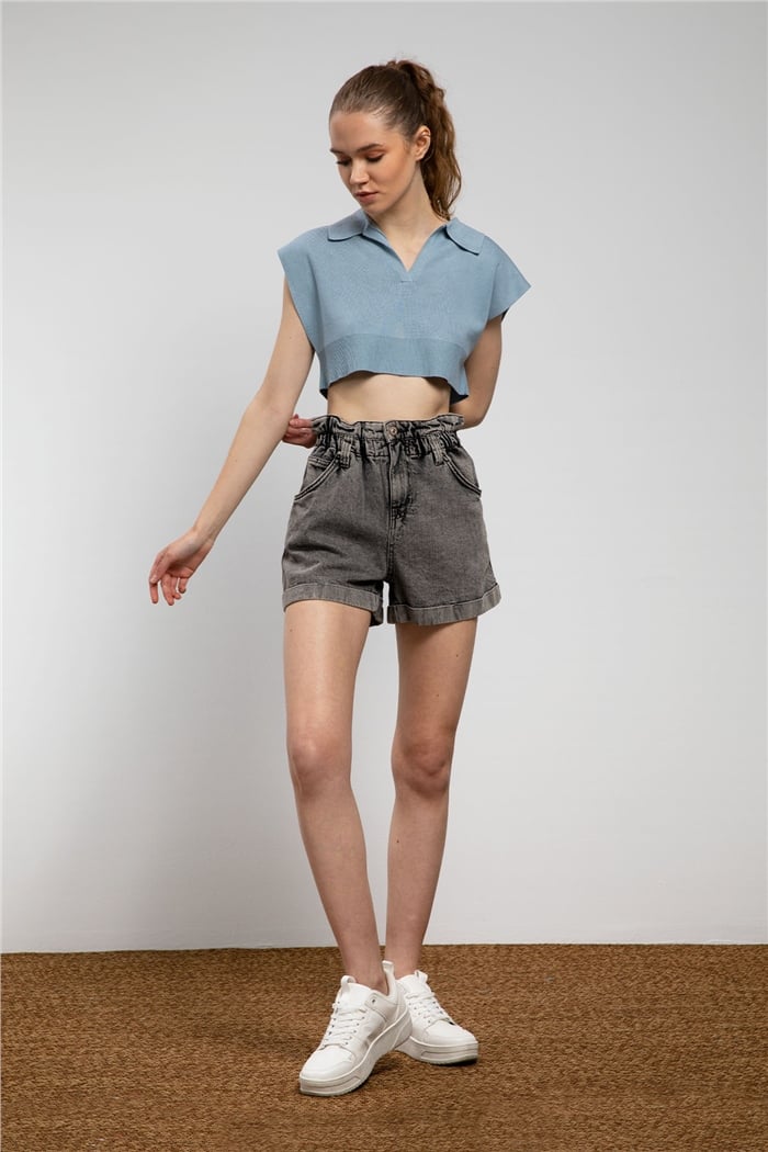 Nisan Kadın Gömlek Yaka Crop Triko Süveter İNDİGO TT3109-Z (TT3109-Z)