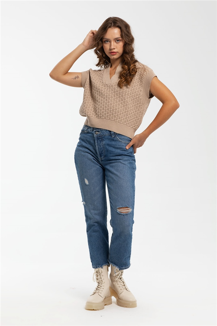 Nisan Gömlek Yaka Patlı Triko Süveter  BEJ  TT3118-Z