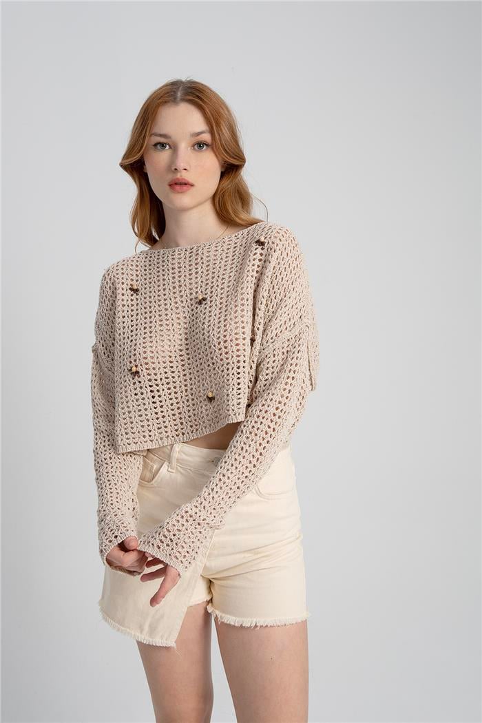 Nisan Kadın Delikli Boncuk Detaylı Triko Kazak BEJ TT3850-Z (TT3850-Z)