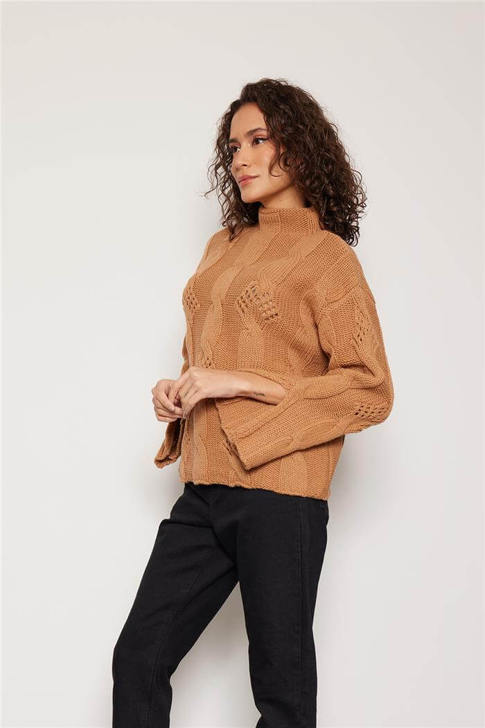 Nisan Kadın SAÇ ÖRGÜLÜ KOLU YIRTMAÇLI TRİKO KAZAK CAMEL TT4204-Z