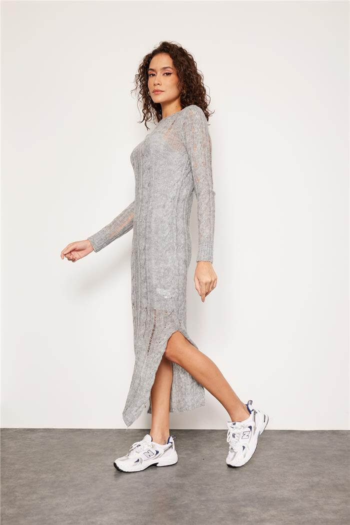 Nisan Kadın Saç Örgülü Uzun Triko Elbise GRİ TT4140-Z (TT4140-Z)