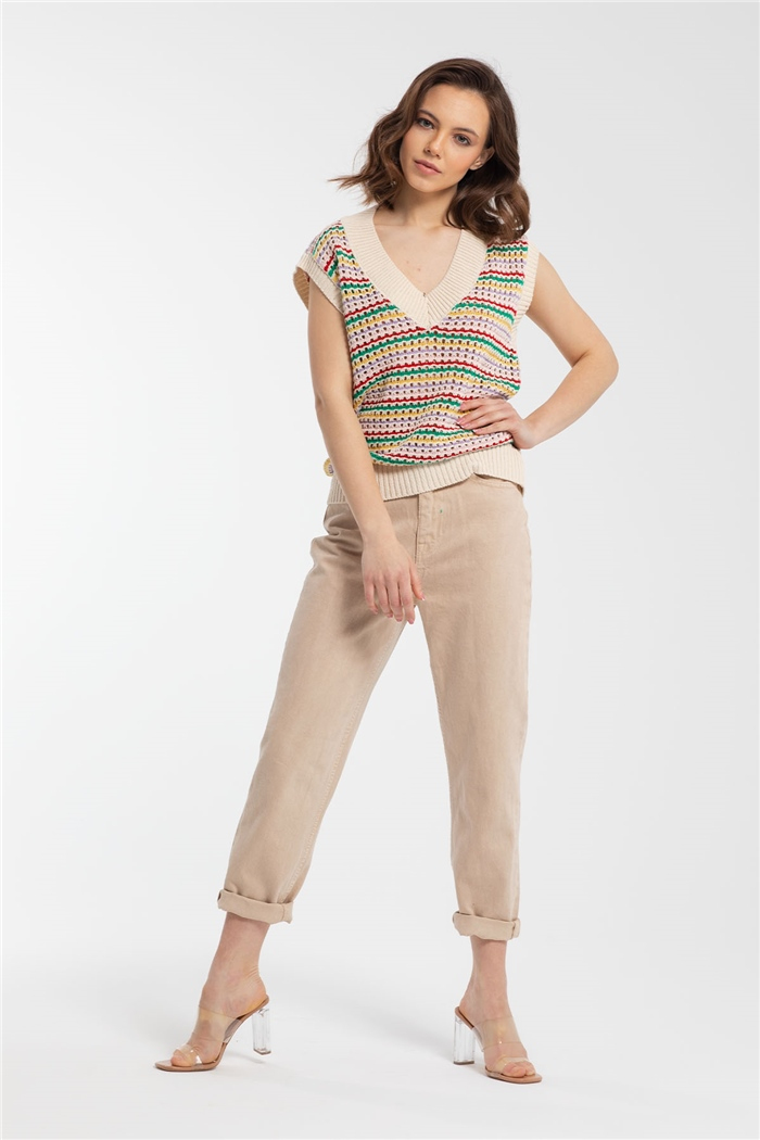 Nisan V Yaka Çizgi Ajurlu Triko Süveter  HAM EKRU  TT3030-Z